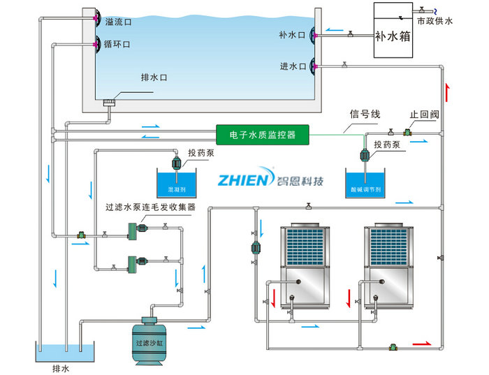 泳池館熱水工程解決方案 游泳池?zé)崴こ桃?,游泳池?zé)崴闆r特殊,一般水溫控制在28攝氏度左右;熱水系…